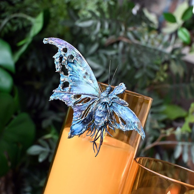 メネラウスモルフォをモチーフに 913WORKS的思考を細部に施した腐蝕シリーズの6つめ 径脈の美しい流れを特殊紙などを用い 数々のゲルやスプレーなどを駆使し表現 体部分は樹脂粘土などを使い制作 腐蝕部分には専用の塗料を複数使い 独特の美しく、なまめかしい腐りを表現 こちらのモデルは一番上の足を曲げてありますので コップのふちなどにひっかけて飾る事の出来るモデルです size detail ・蝶の種類:メネラウスモルフォ 色:腐蝕 サイズ:約縦:8.4cm 横:9.8cm 奥行:7.0cm(手足触角含む) 素材:特殊紙、金属、レジン、粘土、パテ、針金など *オブジェ作品に関して 可動モデルではありませんので足や触角などは 絶対に動かさないでください! それらは特に繊細な作りとなっていますので お取り扱いにご注意ください 特に高いところからの落下にご注意ください 落下の際に足などが曲がってしまう恐れがあります また腐蝕部分には特殊な塗料を多数用いていますので 強くこすったりなどしまうと色落ちの可能性があります また箇所により粒子間を維持する為、コーティングがけなどを 施していない部分もあります、そちらも強くこすってしまうと 色落ちの恐れがありますので、丁寧なお取り扱いをお願いいたします とにかく「美術品」としての扱いを心がけてください *ハンドメイド作品に関して 1つ1つハンドメイドで制作しており ゆえに作りが荒い所がある場合があります 大きさやはねの湾曲さに微妙な違いがある場合があります 色合いや径脈の入り方に差があります 高温の場所に放置すると変形する恐れがあります また雨や水分にあたると 色落ちや変色する場合がありますのでご注意ください 写真と実物では色味が異なる場合があります 手作り製品にご理解ある方のみお願いします
